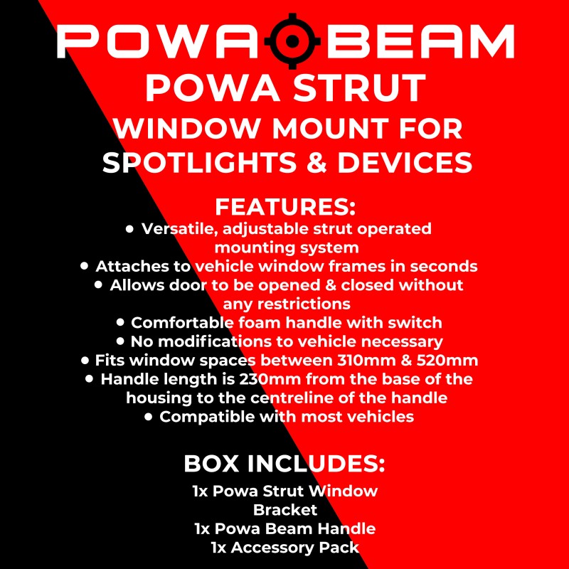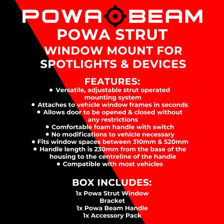 Powa Beam’s new design POWA STRUT Window Mount for Spotlights enables you to fix your spotlight to your door frame without the need to modify your vehicle. This allows you to easily control the light angle and direction using the remote handle so you can spot your target easily. The extra strong, adjustable double gas strut system allows it to quickly attach to most vehicles and the door can still be open and closed without restriction. You can purchase the POWA STRUT Window Mounting Bracket alone or in a package with a Powa Beam Spotlight and Remote Control Handle.